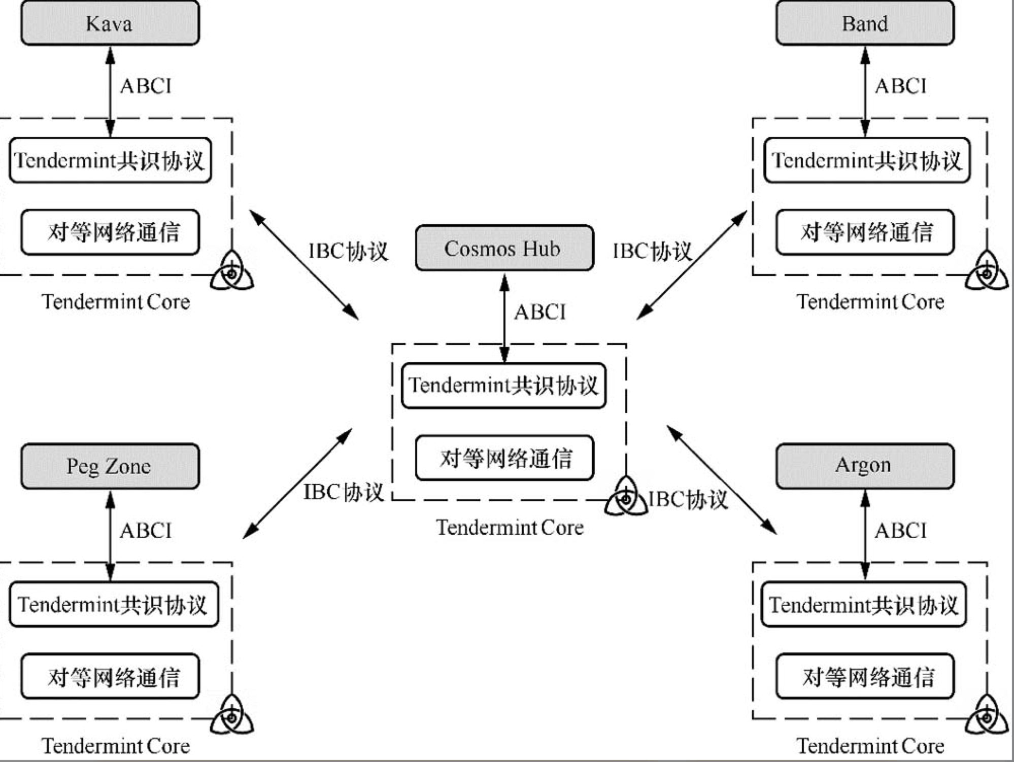 Tendermint Core 中提供了对等网络通信层与共识协议层的实现,并抽象出区块链应用接口(application blockchain interface,ABCI)来完成共识协议层与上层应用层的互动。